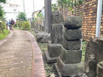 本日は藤沢市文化財ハイキングシリーズ4回目の「長後大山道の文化財」。長後大山道は、江戸時代にブームとなった大山参詣の「大山道」の一つで、戸塚(東海道)と大山を結ぶ道だそうだ。 あいにく天気予報が雨のため、朝のリーダ達の話し合いにより、長後駅周辺のショートコースのみ歩くことに決定。 スタート地点の長後公園へ向かう途中に富士信仰のシンボルである大きな石碑の「仙元塚」が建っており、これも江戸時代の文化財であることを解説書で初めて知った。長後は歴史と信仰がある地域だと出だしから気づかされた。長後公園を出ると「豊川稲荷」と「本妙寺」があるが、社寺が小さいのでうっかり通り過ぎてしまい、途中で引き返す。先行スタッフが道路にチョークで文化財の番号を書いてくれていたので、失敗を繰り返さないように周囲の参加者たちと「これが○○番だよ!」と声を掛け合いながら道路と地図、解説書を見比べて進む。 学問の神様として知られる平安時代の菅原道真公を祀る「長後天満宮」、江戸時代の村の守り神と道標も兼ねる「道祖神」と「庚申塔」、明治時代の「製糸工場跡地」、昭和時代の「土地改良記念碑」等も残されており、まさに歴史をたどるウォーキング。 長後市民センターには、土地開発等で居場所を失った多くの庚申塔や大山道道標が集められているのも驚き、放置されがちな古いものを守り伝える姿勢が感じられた。 引地川へ出てぐるりと回って長後駅に戻ってゴール。幸い、雨は時折パラっと降る程度で傘もささずに歩くことができた。ショートコースではあったが、猛暑のため夏に歩けなかったウォーカーにとっては、丁度足慣らしに適した距離だったとの感想も頂く。文化財も多く、藤沢市の豊かな歴史に触れることが出来たと私自身も感じた。毎回、丁寧な解説書を作成してくださる池内氏にも感謝したい。 (田中 恭子) |