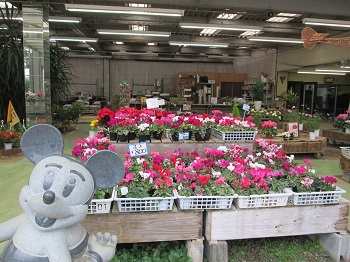 | 花屋には冬の代表的な鉢植え「シクラメン」 | 渋谷の里公園、「子どもとウサギ」の石像 |