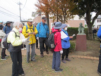 | 朝から曇り空でいつ雨が降り出してもおかしくない天気、予報も午前中から雨になるようである。気温も上がらず15℃以下の寒い中でのウォークメイトとなった。 そんな天気状況から、集合場所を長後市民センターから長後駅西口に変更して受付を実施した。参加者もいつもより少ないように感じた。ウォークメイトの歩行体制はいつもの様に小グループ15~20人で班分けをして、時間を早めて9:40頃出発、1班と共にレポート開始。 最初の立ち寄り個所は長後市民センター。入り口を入ると左手の高い壁面に巨大な陶板レリーフがあった。アートスペース学芸員のお二人(鎌田さんと吉田さん)が既に待機されていて、交代しながらこの作品について詳しく説明してくれた。実物の大きさにびっくり、壁面上段全面に張り付けられた作品は「にっぽんの詩」、右左に風神・雷神、中央に富士山とその下には祭りの情景がカラフルに描かれている見応えのある大作である。 市民センターから出て長後中学校前を通って湘南台方面に向かうと渋谷の里公園に到着、入口でパブリックアートが迎えてくれた。とても愛らしい「子どもとウサギ」乳緑色の石像であった。暫く交代で観賞した。ここまででウォークを終了する4kmコースを選んだ方が4人いた。この公園で2班の到着まで待ち、2班の4kmで上る人達と一緒にスタッフの誘導で湘南台駅へ向かうことになる。 この先、10月4日の例会で歩いた善然寺前を通り境川に出て下土棚遊水地管理棟に到着。トイレ休憩後、いすゞ工場北側を西へ向かう。この辺りから小雨が降り出しこの先が心配された。 チーフの指示でこの先の予定コースを歩くのは断念、小雨の中を慶応大学バスターミナルを目指すことになった。東山田交差点から左方向にコース変更し豊受天神前を通過し歩いていると思いがけず満開のざる菊畑に出くわした。5色のざる菊に参加者から「わーきれい」と歓声があがった。ちょっと得をした気分になった。慶応大学バスターミナルに到着したのは11時半頃であった。 計画していて行けなかったパブリックアートは、少年の森のブロンズ像「友情」と大黒橋のステンレス製モニュメントであった。2か所の写真も参考に掲載しました。 小雨模様の天候の下、全部のコースを歩くことが叶わず残念。お疲れ様でした。 (阪本 茂義) |