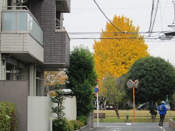 | 2班が長後市民センターに迫ってきた | コース正面の黄葉したイチョウ |