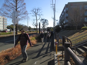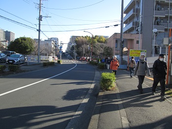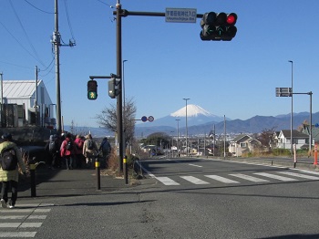 | 公園を出てロングのウォーカーと合流 | 緩い坂を上ると富士の雄姿に歓声 | |