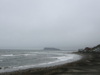 | 辻堂海岸 荒い波に浮かぶ江の島 | 茅ヶ崎海岸ウオークボード 陽が当たりだした |