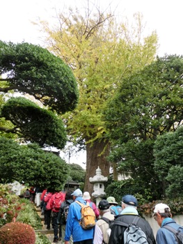 | 湘南台から善行へお寺や神社の大きないちょうを訪ねるウオークである。 今日はこの秋で一番冷え込んだ朝をむかえ、くもり空で冷たい風の寒い日となった。 紅葉した円行公園を10時10分ころ出発、小田急線を踏切で渡り、藤沢街道(467号線)の六会交差点近くの法泉寺の石段を上がると、樹齢約150年といわれる枝ぶりが立派ないちょうが境内を覆っていた。見事な気根の乳垂(ちだれ)が見られた。境内ではこのぎんなんなのか、売っていて買う人が多く見受けられた。黄葉には少し早かった。 藤沢街道を歩道橋で渡り、果樹園がある境川沿いに下り、今飯橋を渡ると東泉寺山門脇に樹齢400年ともいわれる大いちょうがそびえ立っていた。黄葉も進みはっぱを散らしていた。山門の前の道は、新田・足利氏ゆかりの群馬県方面と鎌倉とを結ぶ鎌倉街道(上道)であった。広い境川遊水地公園の縁を周り情報センターに11時過ぎに着き、少し早いが昼食休憩となり、くもり空のもと冷たい風を避けての昼食となった。ここは、洪水調整機能を有す公園であり、運動場は水に沈むこともある。広大な敷地には葦も茂り自然との触れ合える場所で、多くの野鳥を観察することが出来る。 午後から雨が降る予報があり、11時40分と早めに出発、境川沿いを下り、途中から水田地帯の道を歩き金沢橋を渡り龍長院に来ると、大きないちょうが目に入る。樹齢は400年ともいわれ、樹高も高く樹勢も強く、立派ないちょうであった。まだ黄葉せず青々としていた。ちなみに遊行寺の大銀杏は樹齢500年以上いわれいかにすごいかわかる。東俣野中央公園に入ると、美しく紅葉したアメリカ楓に迎えられれた。トイレ休憩していると雨がパラパラと落ちてきた。早々に公園を出発、水田地帯を通り水道橋をくぐり、境川を立石橋で渡ると森にひときわ目立ついちょうが見えた。立石神社の鳥居の前にそびえ立つ大きないちょうであった。立石の急な坂を上り、藤沢街道を横断するとゴールの県立の体育センターで13時過ぎに解散となった。 小雨が降るなか善行駅に向かった。(石井邦敏) |