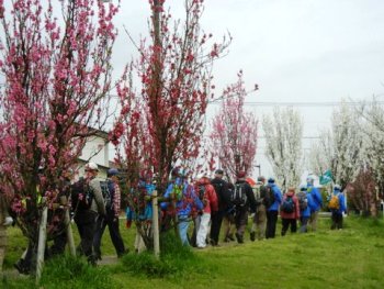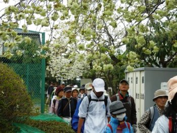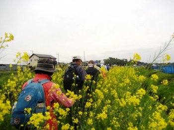 | 気温11度、曇り空、肌寒い朝である。午後から雨になると云う円行公園。公園の回りには桜の木が多い。 すでに満開は過ぎ、赤い花柄が目立つ。9時30分少々過ぎ、出発式が行われた。多くのウオーカーが集まっていた。円行公園の脇に引地川が流れている。盛りを過ぎた桜の木が公園から川沿いの道へと続き、出発したウオーカーの列が白く花びらで敷き詰められた道を行く。 10時過ぎには桐原公園についた。ここでも桜に迎えられた。公園の広々とした芝に大きな桜の木が一本ある。まだつぼみで赤い。八重桜だろうか。少々休憩し、道は下って上って県道43号線に出た。秋葉台運動公園を脇に見て、春の草花が匂う畑の道を行く。やがて企業や工場が立ち並ぶ田方(でんほう)を通り矢尻バス停付近には薄ピンク色の八重桜並木があり、丁度見頃を迎えていた。これで太陽が出ていたらもっときれいに違いない。次に住宅地の中の小道を抜け今日の見どころ、小糸川のしだれ桜が目に飛び込んできた。 250mはあろうか整備された川岸に優美なしだれ桜、ピンク色に咲き誇った枝が川面に向かって滝のように垂れ下っている。これは見事である。カメラや携帯で写真を撮る人がいる。列は橋を渡り、桜のトンネルを行く。近所の人であろうか親子ずれが立ち止まって見上げている。花びらの絨毯の上を進んでいった。 遠藤公園の前を行き、東羽根沢公園に入ってくると、ここも先ほどと同じ種類のしだれ桜が並ぶ。コースはそのしだれ桜の下をウオーカーは進んでゆく。ここ湘南ライフタウンの中の小道、両側が八重桜の並木になっているところがある。その足元に一株のヤマブキが咲いていた。自然の織りなす配色だ。これは正に桜三昧のコース取りだ。西側から遠藤公園に入り小休止。公園を出ても湘南ライフタウンの中の小道を行くと小さな公園、丸山公園の中を一周する。緑色の桜が目についた。御衣黄桜か。まだまだ桜の案内は続いた。 昼食場所の茅ヶ崎里山公園には12時半ごろに着いた。公園の東口より入り「風のテラス」に向かうと、その向こうに長いローラー滑り台、トランポリン、遊具類があり、子供たちの歓声が聞こえてきた。到着したウオーカーは広々とした丘陵地で思い思いに芝に腰を下ろしお弁当を楽しんでいる。 午後はこの先、文教大学前のバス停からお帰りになる方と、湘南台まで歩く人に分かれた。私は湘南台まで同行する。公園の「湘南の丘」には見頃な箒モモが咲いていた。モモの間を縫うように列は進み、谷戸の家、芹沢の池の淵を行き、のどかな里山風景の中を行くと小出川に出た。菜の花が一面に咲いている。人の背丈まであるよう菜の花をかき分けながら、長い小出川の沿道を抜けた。秋葉台運動公園には14時半頃着き、解散となった。丁度、曇り空から小雨が降ってきた時であった。(藤井 誠) |