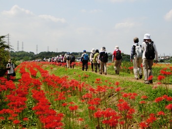 | 小出川の彼岸花は例年ゆっくりウオークとして行っていたが、今年は通常例会として行い、で真赤に染まった彼岸花と黄金色の田園風景を楽しむウオークである。 シルバーウィークに入り良い天気が続き、今日も晴れの天気に恵まれ円行公園には大勢(394名)が集まった。 9時15分に出発、いちょう並木の道を行くと、いすずやリサクルセンターと桐原工業団地などがあり、石川大山交差点で左へ行くと、角のお墓に彼岸花が咲きお彼岸にぴったり。秋葉台運動公園を抜けて、慶応大学バスターミナルでトイレ休憩。ここから小出川沿いのあじさいの道を歩き、大黒橋から彼岸花コースが始まる。ここの彼岸花は地元のみなさんが丹精込めて育てあげたもので、川沿い3kmに渡って赤い帯のように続く。彼岸花は今が盛りで鮮やかな赤が小出橋を中心に川の両側を延々と続く。 今日は彼岸花まつりで会場も設置され賑わいはじめていた。打戻地区に入ると川沿いの道は狭く、彼岸花の中を歩いているようになり、すれ違うのも大変。川の両側には田園風景が広がり、たわわに実った稲穂が黄金色に輝き、コンバインによる刈込も始まり秋色の景色が広がっていた。ときおり鳴る威嚇音(鳥よけ)にはびっくりさせられる。振り返ると川沿い田園のなか、一列歩行の長い長い列と赤い帯状の列が連なり印象に残る風景があった。 新道橋で対岸に渡ると、彼岸花の群生が見られ、赤い絨毯のように広がり見ごたえがあり、彼岸花を目いっぱい楽しんだ。終点の追出橋から寒川青少年広場に11時半ころ到着、ここも彼岸花まつり会場になっており、木陰をもとめて昼食をとる。音楽がながれ踊ったりまつりの雰囲気を盛り上げていた。 12時過ぎに出発、まだまだ暑い日射しが照りつけるなか、寒川の住宅街を通り寒川駅前で12時半ころ解散となった。 花の時期が合わず残念な思いをすることがあるが、今年の彼岸花は見ごろむかえ、黄金色の田園風景とともに十分堪能したことでしょう。(石井邦敏) |
