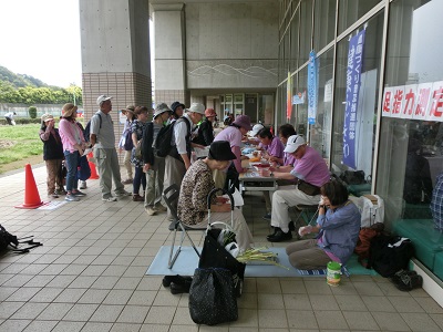 | 受付け風景(17km、14kmコース) | 出発式 藤沢市長の挨拶 |