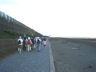 茅ヶ崎公園(野球場)から、7時15分から上がる江ノ島の花火を目指して夕暮れの湘南海岸を辻堂海浜公園まで歩こうという、恒例となったサマーシリーズの定番企画である。明日は立秋、暦の上では秋だというのに、遅かった夏はだだ今真っ盛り。集合時間の頃は暑さもピーク、夏休みとあってか、お子様連れでの参加が数組あり、一服の清涼剤となった。