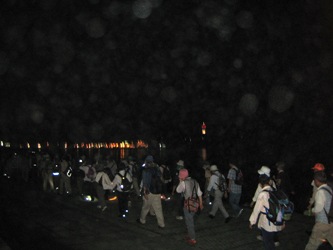 | すっかり涼しくなったこの時期に、秋の気配を求めて、引地川沿いを歩き、また、湘南の代表的な夜景、江ノ島の夜景を眺める、サマーシリーズ最後のウオークである。 集合場所である円行公園で、受付後にサマーシリーズ完歩者(4回以上参加)は、完歩記念として通常例会参加カードが渡された。 16時15分に公園を出発して、すぐに引地川沿いを下流に向かって、サルスベリが咲く遊歩道を歩く。途中、ゆっくりウオークの旗のモチーフとなった言われる、石川岡田橋(カタツムリ)を渡り、田園地帯でたわわな稲穂に、実りの秋を感じながら、親水公園に17時20頃到着。ここで思い思いに軽食休憩をとる。 18時前に出発したが、あたりは薄暗くなり、街灯に明かりが灯り、みなさんも懐中電灯を手して歩く、直に暗くなり鵠沼海岸までひたすら引地川緑道を歩く。茂みから聞こえる虫の音(コオロギ)に癒され、秋の気配を感じる。 海岸は、真っ暗で何も見えない、遠くに江ノ島灯台の光がぼんやり見える。夏の賑わいがうそのようである。この間の台風で砂浜が削られた聞くが、暗くてよくわからない。19時30分頃に江ノ島水族館前に到着、解散式を行い片瀬江ノ島駅に向かった。 たわわに実った稲穂、虫の音、また、静かな江ノ島海岸と夜景に初秋を感じたウオークでした。(I・K) |