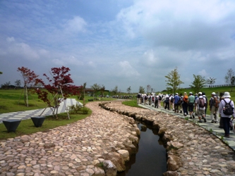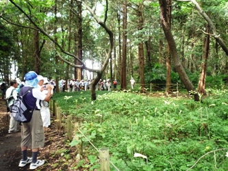| 早朝ウオーク第1回は、藤沢北部(長後)からいこいの森のウバユリを見て、大和(桜ヶ丘)までのウオークである。 この2日ばかり猛暑から解放されすごしやすい気候であったが、今日から暑さがもどり非常に蒸し暑い。 8時15分に長後公園を出発、引地川沿いに出て、畑や田圃を眺め引地川を渡る。住宅地や森を抜けて行くと、大きな森の中に入り、今日の目的の姥百合の群生地帯に入る。白い花が上を向いたり(つぼみ)、横を向いたり(開花)して森の中に、あちらこちらに咲いている。どうやら藤沢(群生)ではここだけのようである。姥百合は、花の咲くころ葉(歯)がなくなることから、駄じゃれで呼ばれているようです。しばらく、姥百合を観賞してから、新幹線を渡り、藤沢ゴルフ場の右側に沿って、そして畑地帯を行くが、風がなく蒸し暑くみなさんは汗びっしょりで、スタッフの方が水をとってくださいと声がかかる。やがて開けた広場が見えてきた。9時40分ころ引地川公園に到着、トイレ休憩。止まると汗が噴き出してくる、ズボンまで汗でぬれている人も、猛暑復活。 ここは、厚木基地の延長線上にあり、ジェット機が上空を飛行することになり、騒音がすごいが今日は静かである。北の方を眺めると基地の広大な芝生と赤いランプが霞んで目に入る。この公園はグラウンドや広い芝生の真ん中に小川が流れ、散策路も整備され、まだ開発途中でまだまだ広くなりそう。 芝生の広場の小川の散策路を歩いて公園を抜け、代官住宅地を通り再び引地川に出て、桜の名所の千本桜の木陰を歩く、約1kmの森林浴を楽しむが風がなく暑い。富士見公園に11時前に着き解散式を行い、ここから10分の桜ヶ丘駅に向かう。約3時間の早朝ウオークでしたが、朝から蒸し暑く、風もなく汗びっしょりになり、後半は疲れたと思います。お疲れさまでした。(K・I) |