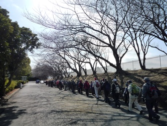 | 3月3日はお雛さまの日、今日の例会は、女性スタッフによる運営で、男性スタッフはフォローにまわる。 今日は、お雛さま寒波による厳しい冬晴れのもと、県立教育センター補助グランド脇に集合した。 帽子にかわらしい桃の花を付けた女性スタッフによる出発式が行われ、9時50分ころグループごとに出発、グランド脇の桜並木を通り教育センター正門を抜けて、立石の住宅地の畑やビニールハウス(花の苗)なかを行き、立石神社を経由して境川を渡り、水田地帯を行くと冷たい風に身をちじめる。横須賀水道橋を潜り、東俣野中央公園でトイレ休憩。 東俣野の畑や民家が混在するなかを進み、所々遠方に横浜薬科大学の塔が望める。坂を上るとこんもりとしたウィトリッヒの森に入り、静かな緑豊かな森を通り抜け、宇田川の両側に桜並木がある芙蓉橋を渡り、交通量が多い道を横断、坂道を上がり横浜薬科大学の裏側に出て、俣野公園に11時45分に到着、ここで広い園内にちらばり昼食をとる。 午後からは、湘南台駅に直行する組とつるし雛(天王森泉館)を見学する組にグループ分けして、つるし雛の見学グループから先に12時30分ころ出発、15分程で天王森泉公園の裏側から到着、つるし雛は天王森泉会館に飾られ、20人ごとに分かれて見学する。この館は、旧清水製糸場で本館を復元した建物で、裏側には雑木林、湧水などありこの辺は公園として整備されている。この館の1,2階の軒下につるし柿がぶら下がっていて、美味しそうとみなさんがいっていたが、実際中に入って見ると、手ずくりのつるし柿(布)だった。つるし雛は1、2階に所せまし飾れ、雛飾りと華やかなつるし雛がぶら下がっていました。飾るのも大変だったろうといらぬ心配をする。30分ほどかけてすべての人の見学が終わり、水田地帯を抜け、境川遊水地公園の脇を通り、民家の見事なしだれ梅に見惚れながら、湘南台の住宅街を行くとゴールの湘南台公園に13時45分ころ到着。 参加のみなさんはウオークとつるし雛を十分楽しんだようだ。真冬のような寒さなか女性スタッフのみなさんお疲れさまでした。ありがとうございました。(K・I) |