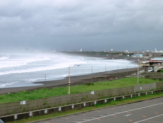 | 西浜歩道橋から辻堂、茅ケ崎海岸を望む 台風12号の余波の波しぶきで霞む |