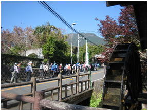 | これ以上求められないくらいの快晴に恵まれて、168人のウオーカーが二宮通り大山道ウオークを楽しんだ。 今日のコースは登り一方のきついコースであることから、三つのコースが選定されていた。 第一は秦野駅前から阿夫利神社下社まで通して歩く健脚向き、第二は秦野駅前からバスに乗り、蓑毛バス停から阿夫利神社下社まで歩く、第三は秦野から歩くが、蓑毛バス停で歩行を中止して阿夫利神社まで行かずに帰るグループ、に分かれて出発した。 16km-コース(全歩行組) 秦野から大山阿夫利神社まで歩くコースをレポートしてみようと思う。秦野(はだの)駅前を流れる、「水無川河川敷」からスタートします。川辺の散策路はタイルレンガの歩道と、花園が清流とマッチして心がすがすがしい気分になってくる。 ここから蓑毛越し(大山阿夫利神社下社)までは上り一方の道でいかにもきつそうだ。 秦野の名の起こりは、平安時代末期から鎌倉時代にかけて、平将門を討伐したことで有名な藤原秀郷の子孫・佐伯経範が1,030年頃この地に移り住んで波多野氏を名乗り、鎌倉時代に入ると幕府の御家人となり、後の戦国大名の波多野氏となるのである。 身支度が出来たら大山道を歩こう。緩やかな上り坂をたどると、名古木(ながぬき)交差点に出る。東西に横切る道は国道246号線(東京−沼津線)で、別名矢倉沢往還とも云う。交差点を過ぎると200m程で左手(西)に折れる。道端には「関東ふれあいの道」の道標が私達を大山まで導いてくれる。 光明院のお寺を回り込むようにしながら行くと、やがて秦野市立東小学校に突き当たる。学校の裏手一帯が波多野城跡である。背に大山を控え、金目川を天然の掘り割りとし、見晴らしの良い高台に攻防兼備の城を築いた。私達も見晴らしの良い「秦野市立東公民館」で一呼吸入れた。駅から小1時間の距離だった。 ここから大山道は、更にきつい上り一方となる。道端に水車が廻り、水車小屋からコトン、コトンと音がする、江戸時代に作られた大山道の石鳥居を横目に、あえぎながら大汗かいてやっと「蓑毛バス停」に着いた。これからの登山を前に大日堂境内で腹ごしらえする、小春日和の暖かい日差しが心地よい。 12時出発、前の人を追い越さずにゆっくり登る。5分程で文化三年(1806)六月建立の常夜灯に導かれて道なりに登って行く、所々林道を横切りながら高度を稼ぐ。一時間程喘ぐと、大山の尾根筋が左から迫ってきて、やっと登りがなくなって道が緩やかになった、「蓑毛越し」に到着だ、ここからは平坦な林道が、私達を大山阿夫利神社下社へと導いてくれる、紅葉が美しい、心ゆくまで、ゆっくり錦秋の大山道を散策する。 鐘の音や鈴の音が賑やかに聞こえてくると、ひょっこり阿夫利神社下社のお堂の前に出る。ゴールです。完歩万歳!まずは神社にお参りしよう。 解散のあとは、ゆっくり女坂を下り、大山寺の紅葉を楽しみながらバス停に向かった。(Y・I) |