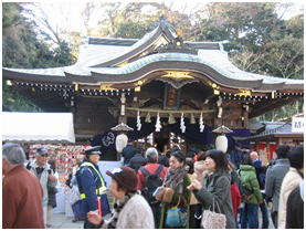 | 頼朝も祈願成就の辺津宮(江ノ島神社) | 今日だけは御神酒を目当てに500人(平野氏撮影) | ||