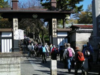 | 藤沢駅より7分ぐらいで藤沢市役所の裏手の若尾山公園にきた。公園の真ん中に大きなイチョウの木があっていい色に色づいていた。すでに受付を終えたウオーカーが朝の日差しの元、樹の廻りで思い思いに過ごしている。 10時15分、4班に分かれての出発である。朝の喧騒の街のなか、境川にかかる御所が谷橋を渡り、藤沢団地へとゆるい坂をゆく。登り切った坂上を左に曲がり、団地の隙間から真っ白な富士山が一瞬見えた。「富士山だ!」と思わず口に出た。やがて、国道1号線を超えて、日本三黒門の一つ総門をくぐり、歳月を経た四十八段の石段の両脇はすでに葉が落ちた桜の並木だった。登りきると、時宗総本山遊行寺が表れた。東海道随一の木造建築と言われ立派なものだ。広い境内にある大銀杏は藤沢一の太さだという。 遊行寺を後にして、東海道を北に上り、樹木が生い茂る歩道を行き、住宅地へと左折し突き当たりが、旧モーガン邸の門であった。「旧モーガン邸を守る会」の人に門を開けて頂いて、中に入ることが出来ました。鬱蒼とした木々に囲まれたアプローチを進むと、モーガン邸のシンボルである美しいデザインが施された中門が表れ、正面にはソテツの築山になっていた。我々はその築山を一回りしてみると、消失した館の玄関部分だけが残っていて、未だにテントで覆われていた。「守る会」の人による、旧モーガン邸について解説して頂いた。大きなヒマラヤスギ、あばれた枝の威厳のある大木と、濃いグリーンに塗られた美しい門との調和が心に残った。 再び、正門に戻りすぐ脇道を入り、隣接する外原公園で昼食となった。住宅地のなかの芝生の公園だ。日だまりの草に腰を下ろした。 午後は、今日の目的であるフラワーセンターの菊花展の観賞をもとめて、約3km半ぐらい歩いて行く。フラワーセンター大船植物園に入園するには65歳以上の方が100円である。入口に神奈川県菊花大会と看板が掲げられていた。入場するとそこは秋の花々があちこちから迎えてくれていた。正面奥にすだれ囲いの菊花展示がならんであり、近寄ってみて懸崖菊の見事な作品に見入った。菊の種類も豊富で「細管」とか「太管」、黄色や白、ピンク色の大輪。また、パンダの形をした菊仕立て、それと感心させられたのは「千輪仕立て」という1本の菊を大きな傘状に仕立て100輪以上は咲かせているのが見事であった。人気の作品には人だかりがしていた。入場者数は174人、カメラ、携帯で写真を撮る人、じっくりと見とれている人、思い思いの観賞が出来たのではないでしょうか。(藤井 誠) |