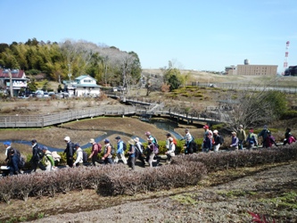 | 横須賀水道みちは、シリーズ3回目で葛原(いすゞ自動車前)から相模川にかかる上郷水管橋までたどるウオークである。 今日は、昨日まで寒い日が続いていたが、いっきに気温もあがり、風もない春らしい陽気になり穏やかなウオーキング日和となった。ただ花粉症の人にとってはつらい季節になった。 長後駅近くの大きないちょうとさくらに囲まれた長後公園に大勢のみなさんが集まった。 10時前にショートコース(12km)、ロングコース(19km)に分かれ、ロングから出発、市民センターの前を通り、引地川を渡りいすゞ自動車のあたりから、スタッフが今日の水道みちがここから始まると案内する。ここまででこの暖かさでジャンパーを脱ぐなど早くも身軽な格好になる。 住宅地を抜け、郊外の畑地帯を真っ直ぐな水道みちが続き、梅もいっきに花開き見ごろになった。所どころに水道管が埋設を示す標識が現われるが、道端を注意して見ないと見逃してしまう。春の陽気につつまれてのぞかな畑のみちを歩く。 新幹線をくぐり、交通量の多い中原街道を渡り水道みちを迂回し、綾瀬浄水場そばの蟹ヶ谷公園に寄りトイレ休憩、後から来るショートはここが昼食となる。見晴台からは雪を頂いた大山や丹沢が一望できるが、富士山は春霞で望むことが出来ない。湿生園では、湧水を利用してカキツバタ、花菖蒲の植え替えの作業していた。池の周りの木橋には、望遠カメラが並びその先のカワセミの餌をとる瞬間を狙っていた。20分ほど休憩して、ゆるやかに流れる目久尻川の土手を気持ちよく歩く。堀之内橋で渡る水道管が姿を見せ、ここから水道みちに合流し、一般道をどこまで真っ直ぐな水道みちが続き、良く見通せることが出来る。 ロングは、途中で迂回して大谷近隣公園に12時過ぎに到着、陽だまりに腰を下ろし昼食をとる。ここも霞みかかった丹沢山塊が一望出来た。 12時45分に出発、再び水道みちに合流して、梅の花など楽しみながら行き、丘にかかる切り通しのような道を抜け、住宅と水田地帯が広がる中を行くと遠くに海老名駅近くの高層建物が見えてきた。ショートは、バス停みずほ団地前で解散となる。ロングは水道みちをジグザクに歩き、相模川に架かる水管橋が正面見えると、有鹿神社に回り相模川沿いの遊歩道から上郷水管橋を眺める。今回の水道みちはここが終点になる。遊歩道さらに遡ると、土手には春色のパンジーや菜の花が向かえてくれた。やがて広い河川敷の県立相模三川公園(相模川、中津川、小鮎川の合流する近く)13時30分ころ到着、ここで解散、海老名駅に向かった。 今日の水道みちは、郊外の畑や水田なかを歩き、真っ直ぐな水道みちらしさを感じたウオークではなかったかと思います。水道みちを示す標識をいくつ確認したでしょうか。(石井邦敏) |