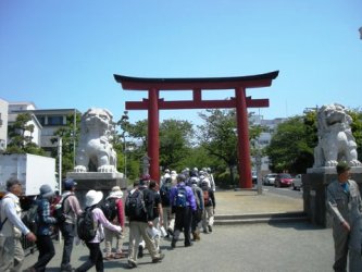 | ここのところ五月晴れが続いてる。今日も爽やかな日になりそうだ。「鎌倉道を歩く」本日は5回目になった。いつもの鎌倉海浜公園由比ガ浜地区の江ノ電・タンコロが展示してある公園だ。鎌倉の海の正面には大島がくっきりと姿を表していた。 出発式を終えて、1・2班はロングコース、3班はショートコースとしてスタートした。私は1班であった。 由比ガ浜海岸を背に若宮大路を鶴岡八幡宮に向かって歩き出した。やがて一の鳥居が見えてきた。花崗岩で作られこの鳥居は関東大震災で倒壊し昭和11年に再現されたという。道は「下馬」の信号を過ぎ横須賀線のガードを越えると、二の鳥居が見えてきた。「段葛(だんかずら)」の入口にあり、朱塗りの鳥居でその前に狛犬が鎮座している。鳥居を潜り段葛へと、新緑となった桜並木を抜けると、三の鳥居だ。大型観光バスが行き交う交差点を渡り、鳥居を潜ると大きな太鼓橋、現在は渡れないが、その脇の赤い橋を渡って、舞殿に向かった。小学生の団体が我々と同じように列をなして石畳を進んでゆく姿を目にした。石段の下から見上げた鮮やかな御社殿の朱塗りの色と廻りの新緑の杜との調和が日本の美しさなのだ。石段には参拝客が上り下りしていた。輪切りとなった大銀杏は残念ながらまだ緑は見えない。 八幡宮より巨福呂坂を目指した。車道の脇を一列で上ってゆくと昔は切通しであったろうが、今は車が行き交うトンネルだ。切通を下ると、建長寺を過ぎ北鎌倉にきた。横須賀線の線路脇を真っ直ぐ進み、円覚寺の山門前より踏切を渡り、白鷺池から県道に出た。こんな所に土手が、と思うところで小休止。北鎌倉駅前の交番脇の小路を入っていった。「おちゃぶきさまの小路」に入ったなと思った時には「おちゃぶきさま」を見過ごしてしまった。後ほど「おちゃぶきさま」について調べたら、風邪の神様で石積みにお茶碗が供えられているという。 狭い小路を曲がりくねって進んでゆく。“よくこんな路を探したものだ!”と後方から話声が聞こえてきた。気づいたときには中山稲荷社の鳥居から赤い祠が見えていた。更に狭い路を進み「光照寺」の石碑脇の石段を上がった。山門を潜り本堂なのだろうか普通の民家のように思えた。庭には石楠花の花が咲いていて、所狭しといろいろな植物を目にした。裏側の墓地から出て、風情ある路地を抜けると県道に出た。「水堰橋」と書かれて橋、「せいしく橋」とも呼ばれている。信号があり橋の上を斜めに渡る横断歩道を先に行くのだが、ここが橋とは気づかずに進むところであった。鎌倉街道中の道は更に進む。 大船に入ると広い道と小路の交差点にお地蔵様があって、石柱には「旧鎌倉街道中の道」、「離山富士見地蔵尊」と書かれてあり、近所の人であろうご婦人がお地蔵様のお花を取り替えてるところであった。やがて、12時頃には豊かな緑の中、近代的な施設、鎌倉芸術館前に到着し、3班のショートコースの人たちはここで解散となった。1・2班は鎌倉芸術館と並ぶイトーヨーカ堂の脇の空き地にて、昼食を済ませた。 午後出発して笠間十字路の陸橋を超えると、いたち川に架かる「新橋(にいばし)」にきた。橋のたもとには延命地蔵と、その横に道標が残されていた。今回のチーフリーダーが道標の説明をしていた。リーダーの熱心さが伺える。我々は戸塚へ向かった。JR根岸線を潜ると三島神社。朱塗りの鳥居を抜けて正面脇から出て、飯島市民の森へと向かった。上りきった坂上にはキリスト教会の屋根に十字がそびえていた。教会のご厚意によりトイレを使わせていただいた。 小休止後、教会の裏門から市民の森へと入っていった。この尾根道も旧鎌倉街道だとリーダーは説く。雑木林の森から抜けだし、再び県道を進み、環状3号線を超えて住宅地の奥へと進むと、突き当たりに急階段が有る。登り切ると倉田小学校の脇の公園に出てきた。ここで一息つくと正面に姿よき富士山が迎えてくれた。そして、少し下った所に「實方の実家」だという民家の前を過ぎ、實方塚の道標から入ると山道沿いに、平安時代の歌人、百人一首でおなじみの藤原實方の供養碑と歌碑があった。ここでもチーフの説明をうけ、山道を抜けると東海道線が見えてきた。線路脇を進むとゴールの横浜フォーラムであった。 このコースはかなり起伏に富んだ道程であったが、新しい発見のある道を歩かせて頂いたし、心地よい疲労感を感じるウオークであった。そして朝、配布された地図の裏面に各所の解説が載っていて、参考になりました。(藤井誠) |