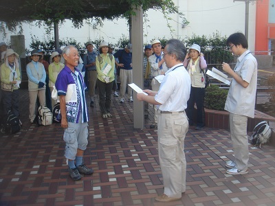 | 5月〜7月の60景観歩者20名に対し、まちづくり景観課長から表彰があったのち9時20分、サンパール広場を出発。 南口から出て最初に訪れたのは、「新しい住宅地 海辺の住い」(鵠沼景観‐10)、敷地際の石垣と松を残したマンションが評価され選定されたとのことであるが、「海辺の住い」は海岸まで3km以上もある。鵠沼橘、鵠沼桜が岡の住宅地を通り、鵠沼藤ヶ谷にある「桜小路公園(はす池)」(景観‐9)を訪れた。かつて境川の曲流で七つの池が出来たそうであるが、現在は二つの沼が残る。第二はす池は一面、はすが生茂り所々に大きなはすの花がまだ咲いていた。はす池を後に江ノ電の柳小路から鵠沼までの沿線を歩く。「住宅地を走る江ノ電」(景観‐8)は緑豊かで鵠沼らしい風景である。鵠沼別荘地の守護神を祀る賀来神社、サーフボードの型をした碑は勝海舟の奉書であった。鵠沼松が岡、桜が岡は別荘地として開発された所、松も残るが、相続からかミニ開発も進む。写真にある「松並木の続く住宅地」(景観‐6)は、美智子皇后が一時疎開し学校へ通った道で地元の人は美智子皇后思い出のみちと名付けているとか。 境川の右岸に出てると、車が通らない遊歩道「遊歩道と松とボート」(景観‐7)、休日はジョキングや散歩、サイクリングを楽しむ人で賑わう場所である。ポンプ場の辺りには江戸時代、物資の荷揚げをした紋十郎の河岸、知る人は少ない。 西浜橋を渡ると江ノ電湘南海岸駅、後にしおさいセンターという施設がありトイレ休憩。出発してから5.4km地点。気温も上がって来たので、お疲れになった方はここまで。467号線を横断、昨日、大祭が行われた下諏訪神社の神域を通り片瀬山の住宅地へ。急な坂道は本日一番の難所、標高60mの高台の高級住宅地はかつてゴルフ場があった所で、昭和40年代に急速に宅地化された。石畳の坂道は都電の敷石を利用したもの。上りつめた片瀬山ビューポイントは箱根連山、大山連峰、相模湾、藤沢市を一望する絶景ポイント(片瀬景観‐1)である。残念ながら山々は霞んで観られなかった。9月1日(日)にも同じ場所を通る例会があるので、期待したい。下って、新屋敷橋、境川左岸の道をとおり新林公園(村岡景観‐1)に着いたのは12時を少し過ぎた頃であった。ウォーキング教室、完歩表彰の後、12時20分解散となった。(八柳修之) |