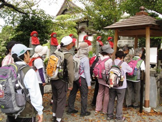 | 夜来の雨も上がって、秋らしい爽やかなウォーキング日和になった。 10時20分。338人のウォーカーが、湘南台円行公園を4班に分かれて出発。秋葉台運動公園でトイレ休憩して藤沢の名刹 寶泉寺に向かった。遠藤は藤沢でも農業の盛んなところである。秋空の下、広々とした里の小道を往くのが心地良かった。 寶泉寺は曹洞宗の禅寺である。境内には紅い萩の花が風に揺れていた。長蛇の列ができている。何事かと先頭に近寄ると“おびんずるさま”。“賓頭盧尊者”という撫で仏で、皆さんが体の具合の悪いところを、おびんずるさまの同じ個所に手を触れておられる。 寶泉寺を出るとまもなく小出川に出た。「小出川彼岸花まつり」の幕がかかっていた。今年の彼岸花ウォークはピッタリと開花にタイミングが合った。小出川沿いに3kmにわたって、紅く艶やかな彼岸花の群れが伸びている。私たち以外にも多くの観光客が来ていた。ススキが穂を出している。稲田と彼岸花もマッチしていい風景だ。予定時間も超過気味だし、細道を一般観光客と合流しかけたので、沿道の途中から芹沢方面にコースを変更した。 県立茅ヶ崎里山公園の「里の家」裏手の広場で昼食。12時50分里山公園に向けて出発。途中コスモスがあちらこちらに咲いていて、ここにも秋があった。1時20分。里山公園で10qコースと20kmコースが分かれるため班を再編成。10q(文教コース)は文教大バスターミナルでゴール。13km(香川コース)は小出川せせらぎ公園を経由して相模線香川駅でゴールとなった。 秋らしい「ゆっくりウォーク」であった。暖かい日差しのなか、時おり涼しい風が吹いて気もち良かった。彼岸花はじめ萩やコスモス、茶花等も見られて楽しい一日を過ごした。(川澄武雄) |