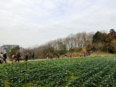 | 鎌倉古道中道の一部分を本郷台駅から東戸塚駅まで公園や森の尾根道を歩く。 2日前から今冬一番の寒波に見舞われ、冷え込んだ本郷台駅前ひろばは、寒風が吹き寄せ震える出発式となった。 9時40分ころ班分けをして出発した。JR線路を潜り本郷台の住宅地を通り、環状4号線を見晴橋で渡り、1月末から2月始めの異常な暖かさで一気にほころんだ梅を眺め、雑木林の生い茂る道を上がると、見通しの良い高台にでる。舞岡公園の手前に笹に囲まれ道標があり、かまくら道と刻まれている。公園には南門から入り、森に囲まれた黒々と耕した耕作田んぼの谷戸の風景に癒され、公園の中ほどの小谷戸の里で休憩する。 途中ではしゃぐ園児の列に、なんとはなしにハイタッチして通りすぎる。体験畑から狐久保の森へ登り、明るい尾根道に出る。風もなく気持ちよく尾根道のウオークを楽しむが、途中林が途切れた所では、凍った道が融けて泥んこ状態に苦戦して靴が汚れる。歩きやすいふるさとの森を下り、田んぼ沿いを歩き、小川アメニテイ散策路を行くと地下鉄舞岡駅に到着、10kmコースはここがゴールとなる。 14kmコースは、近くの舞岡地区センターで昼食休憩。冷たい風が吹き抜けるなか、思い思いに場所を選び楽しみな昼食をとり、陽が当たるとほっとする。 12時30ごろ出発、小川沿い行き常玄寺前を左折して上がって行くと、下永谷市民の森に入る。梅林では蕾もほころび、この寒さでしばらく足踏みしそう。ここには、鎌倉古道がそのまま残っており、当時に思い馳せながら尾根道を歩く。上柏尾の雑木林では、あまり歩かないような道を落ち葉踏みながら、尾根道をたどって行くと御嶽神社にでる。神社の急な石段を下りて、国道1号線(東海道)にでる。前方に三つの高層住宅が見えてくると、ゴールの東戸塚駅に13時30分ころ到着。 今日はとにかく風が冷たかったが、コースはリーダがこだわって設定した変化に富んだ尾根道のウオークを満足したようです。(石井邦敏) |