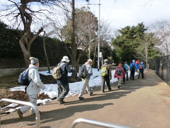 | 爽快(総会ウォーク)は藤沢本町から鵠沼運動公園や鵠沼松が岡公園、山本公園を経由して江ノ島までのウオークである。 今日は先週の大雪がいまだ多く残り、空気が冷たく寒い、雪が融けてなくらないと暖かくならない。 藤沢本町駅近くの集合場所の伊勢山公園は、200段の急な階段を上がり、途中91歳の人が登っていきましたよとスタッフの声に励まされたが、リーダがいう爽快感を味わえたでしょうか、それとも?ですか。 この公園は、藤沢市の第一号公園で、以前はさくらの名所でしたが、今はさくらの切られて面影はないようです。また、藤沢市街と江の島を望む、見晴らしの良い場所でもある。 9時20分ころ、河津さくらが咲き始めた公園を出発、尾根道には雪が残り注意して、国道1号線に下り、湘南高校の裏側を通って引地川に出る。上村橋で対岸に渡り、東海道線を潜ると親水広場に出る。ここでトイレ休憩、この辺りでは雪は融けてしまったようだ。 富士見橋で左岸へ渡りしばらく行くと、鵠沼運動公園に着く。SL広場を一周し、展示してあるC11蒸気機関車を見学する。SLの周りにはミニ鉄道が引かれているのが気付いたでしょうか、毎月一回ミニSLが走り、乗ることも出来る。(寄り道・道草53を参照) 小田急線を渡ると松と砂地の鵠沼松が岡公園に入る。立派な大きな松林が地元の保存会のみなさんで守られ、憩いの場になっている。鵠沼松が岡の閑静な住宅地の入り組んだ道を通り、境川に出てしばらく行くと、11時20分ころ山本公園に到着。ここで昼食休憩をとる。 12時前ここで解散となり、総会に出席しない人は、直接片瀬江ノ島駅へ。出席する人は、総会場所のかながわ女性センターへ。江の島弁天橋を渡ると江の島は観光客で賑わっていた。残念ながら富士山は雲に隠れ、すばらしい景色を見ることは出来なかった。かながわ女性せんたーには、早めに着いた。 13時30分から123名の出席で総会が始まり、とどこおりなく進み1時間ほどで終了した。(石井邦敏) |
