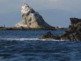 江の島・片瀬海岸から茅ヶ崎海岸まで約10q、海岸沿いにサイクリング ロード(遊歩道)が伸びている。茅ヶ崎海岸までは、きれいな冬の富士を 見ながら自転車で走って来たのだが、乗船して船が烏帽子岩に到着した時 富士は雲に覆われて頂上しか見えてなかった。 それでもさすがに間近で見る烏帽子岩は波濤に鍛えられて稜稜としている。 14mというから3,4階のビルの高さだ。高所は海鳥たちの糞で白壁でも ある。岩礁は波浪に洗われ、ヒジキやハバノリなどの海藻で覆われている。 私は半世紀前に上陸して以来なので大変なつかしかった。 |