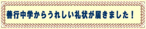 | 学年行事の「2年地域めぐり」としてより良い社会をめざし、社会貢献しているボランティア団体の活動を知り、それぞれに係る人達の生き方を考えさせたいと、FWAに依頼が来ました。 FWAを選んだ生徒さんからは事前に聞いてみたいことをいただき、12月2日平野会長と西澤事務局長が善行中学校を訪問、6名の生徒さんの質問に答えました。 約1時間20分でしたが、ウォーキングの楽しさに興味を示していた様子を感じました。 後日、善行中学 十川由利校長と2年学年主任持田早苗先生からうれしい礼状がFWAに届きました。(平野) |
