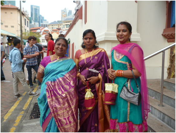 | 参列者の奥方達、インドの民族衣装で結婚式の正装。中央のご婦人は左右の二人より色が黒く、スリムで面長であるから、タミル人(インド南部)と思われる、 両端のお二人は体格もよく、ふくよかな顔をしている、きっと裕福な家庭の奥様だろう、カメラを向けるとにこやかにポーズをとってくれた。 |