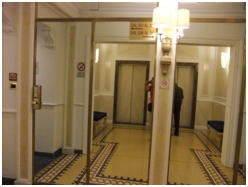 | ホテルのキーはカードでエレベーターに乗るときもカード使用のホテルあり。 初めての人は戸惑っていた。寅次郎はイスタンブールで初体験済。 エレベーター内には閉のボタンはありません。開のボタンの隣はベルの絵のボタンでアラーム。早朝の散歩時に降りる際に間違えて押し、フロントマンに1階で待機された、寅次郎思わず「ノー プロブレム」と対応。 ローマのホテルの寅次郎の部屋はガラスの部屋。前のエレベーターがガラスに映っている。左端のガラス戸が入口ドア。最初はうろうろ入口を探した。室内はガラス張りではありませんよ。 |