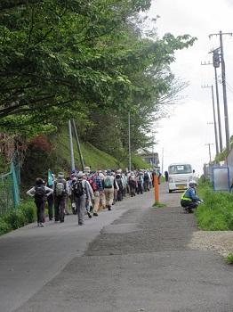 | 今月のウォークメイトは<善行・藤沢の景観めぐり>である。善行公園が珍しく集合場所となった。145人の参加、このうち一般参加者が39人(初参加者24人)だった。出発式のあと、2班に分かれて出発した。そしてウォークメイトとしては今回初めての試みだが、初参加の人や初心者の皆さんに、二つの班の前を歩いてもらった。 新緑のなか、白や緋色のつつじが満開の県体育センターの横を抜けるとグリーンハウス。ここは先の大戦時には海軍のゴルフクラブハウスであった。スペイン風洋館の面影をいまに残している。横須賀水道みちから境川に出て、堤防を歩き大清水橋をわたる。この辺りあとひと月もすれば、川岸にあじさいが咲き乱れる。大清水浄化センターから湘南バイパスを潜り、再び水道みちにもどると上り坂である。坂の右が広く造成されて様変わりしていた。2年ほど前は斜面に草木が繁茂して酷いものだったが、いまは見事に造成が進んでいる。メモリアルパークになるという。翠ヶ丘公園でトイレ休憩した。 旧1号線に出ると遊行寺坂。時間が押し気味なので遊行寺境内に入らず、黒門から竣工間近のふじさわ宿交流館の前を通って旧藤沢宿へ抜けた。ふじさわ宿交流館は4月29日のオープンで、多彩な祝賀イベントが予定されている。正午過ぎに御殿辺公園に着いた。ここで昼食をとりその後完歩者表彰、ウォーキング教室(携行品について)をし、午後のために少しストレッチをして出発した。 白旗神社は境内にたくさんの大小鮮やかな鯉のぼりが風を受け泳いでいた。小田急線を渡り、1号線沿いから伊勢山公園に出てここで解散した。(川澄武雄) |