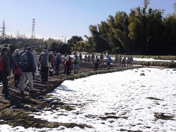 | 3日前の1月22日の大雪(降雪量は20cm余り)と今季最強の寒波が到来し、集合場所の相鉄線「三ツ境駅」近くの「二ツ橋公園」は凍りつくような寒さというか冷たさであったが、FWA今年最初の「ゆっくりウォーク」とあって、大勢の参加者が集まって、残雪の公園の中、賑やかな話題で盛り上がっていた。 馬場会長の挨拶、チーフリーダーによる本日のコース説明、次回案内、ストレッチ体操で身体をほぐし9時50分に公園をスタートした。まだ雪があちこちに残り、凍結し滑り易くなっているので、転ばないように注意してほしいとの話を受けて、慎重に歩き出した。 本日のコースは阿久和川沿いの瀬谷に残された歴史と自然をめぐるコースであるが、先日の大雪でまた違った姿を見ることが出来るかもとの期待を持ってスタートした。 スタート直後から路肩の雪に注意して、暫く住宅街を行き、周囲の畑の真っ白に積もった雪をみて、最初の「長屋門公園」に向かった。 ここには江戸時代後期に造られたといわれるかわらぶき屋根の民家があり、その中には囲炉裏、かまどなどが昔ながらの生活の雰囲気が味わえることができると説明書に書かれているが、本日は入口の昔ながらの立派な長屋門を眺めて通過した。 次に向かったのは、「大きな傘みまもり広場」と標識のある公園?であった。坂を上り、下りして、今度は「阿久和東宮ノ腰公園」へ向かう。ここでも残雪に気を付けながら上り、下り、そして次は「阿久和大久保原公園」へ向かう。途中右手方面に真っ白に雪をかぶった「富士山」が見え、シャッターを切る参加者が多かった。林を抜け公園に到着。トイレ休憩といえば、急を要する人は「長屋門公園」であったがそれ以外は、立ち止まることなく進んできた。この先、曹洞宗「観音禅寺」(阿久和村の領主、安藤冶右衛門正次が先祖の冥福を祈るために創建したと言われている)の脇を通過して阿久和川に出て、川沿いを暫く行き、最後の訪問先「中丸家長屋門」に到着。中丸家長屋門は明治18年(1885年)頃建てられ、2階建入母屋造銅版葺、桁行き8間・梁間3間の出桁造である。平成13年には「横浜市認定歴史的建造物」に選ばれている。(HP資料参照) また、長屋門の入口右には可愛らしい「長寿地蔵尊(ぴんころ地蔵)」があり、やさしく微笑みながら、ほほに右手を添えていた。健康のまま天寿を全うする意味の「ぴんぴんころり」をヒントに命名されたものである。 ここを出て、雪が残る道を注意しながら進み、12時頃にゴールの弥生台駅前公園に到着、怪我人も無く、無事に全員ゴール出来ました。ご苦労様でした。 (露木 照久) |