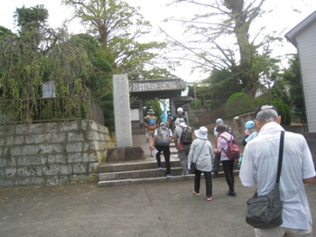 | 今日は先日来の雨の予報が変わって終日曇り空の一日らしい。そんな空模様の中、集合場所の若尾山公園には80名を越える参加者が集まってくれた。 チーフリーダーによるコース説明で雨の心配がある為、一部コースを短縮するとの説明があった。 昨日、今日は藤沢市民まつり。その日を選んで設定した今日のウォークメイトは、祭り気分の中の藤沢宿にある社寺と旧跡を訪ねる。 3班体制に小分けして10:20頃出発。公園を出て境川を渡り左岸を溯る、川沿いに奥田堰跡の石碑の前を通り車道に出て、舟玉神社を左に見て先にある遊行寺を目指した。遊行寺の境内では、昨日はプロレスが開催され大変賑わったようだが、今日は何も催しがなく静かでひっそりとした寺らしい雰囲気に戻っていた。いろは坂を下って「ふじさわ宿交流館」でひと休みして白旗神社、義経の首洗井戸を経由して済美館へ、ここでは休憩と完歩者の表彰を行い、6人の方が表彰された。おめでとう! この先、真言宗 荘厳寺を訪ねる。この寺では事前に住職にお願いし本堂を公開して頂き、中に上って、ご本尊の不動明王(運慶の作と伝えられている)と、白旗大明神と書かれた源義経の位牌を拝観させて頂いた。境内には相模国準四国八十八箇所のうち四番と十番の弘法大師石像が安置されており、FWAの相模国準四国めぐり例会でも2017年10月に巡拝している。 更に近くの浄土真宗 永勝寺を訪ねる。境内には旅籠小松屋で飯盛り女として働き亡くなった人の墓石が幾つも立っている。寺から寺へ続く細い道を縫って脇にそれて上って行くと小さな祠がり、中には弁慶塚と彫られた石塔が建っていた。一旦車道に戻り、その先の本町郵便局脇から右折し左の脇道に上って行く。笑宿庵跡(医師の小川泰堂居住跡*)と説明され、あまり広くない敷地がそこにあった。説明板は無く、今は小さな教会の建物が建っているだけである。 更に細い道を上って行くと藤沢小学校の裏手に出た、周りは木々に覆われ薄暗い道でこんな所を通るのは初めてである。坂道と階段を下って広い車道に出ると藤沢橋交差点近くであった。更に駅に向かって旧江の島道に入ると間もなくゴールの蔵前ギャラリーに12時過ぎに到着、参加者はIVVを受取り市民まつりで賑わっている駅方面に消えて行った。お疲れ様。 駅近くまで来ると周辺では市民まつりもたけなわ。丁度、湘南なぎさ連の阿波踊り、太鼓や笛の音色が賑やかな山車がゆっくり大通りを練り歩いていた。大勢の人が繰り出し、大変賑やかな駅周辺であった。 *小川泰堂:文政から明治にかけて、父のあとを継いで医者として地域に貢献、藤沢の発展に尽力、「高祖遺文録」や藤沢の古典地誌『我棲里』などを執筆、すぐ近くに小川家の墓地もある。 (阪本 茂義) |
