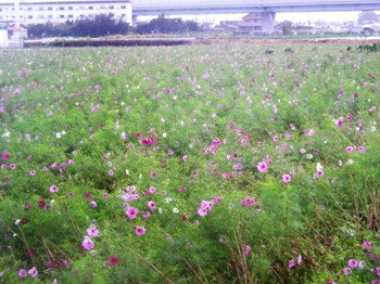 | ここのところ台風による被害災害が続いている。今日も関東地方に低気圧と台風に伴う大雨、土砂災害や洪水の警報が出た。茅ヶ崎駅に雨降る中、係員が集合して本日の歩行は断念することにした。しかし前もって中止を告知した訳ではなく、参加者が来られる為に受付を開く。受付場所は本来ならば茅ヶ崎市中央公園であるが、茅ヶ崎駅改札口まえの空きスペースを利用し受付が開始された。9時過ぎの受付時間には何人かの参加者が雨具姿にて現れた。次々と参加者が来る。それぞれ受付を済ませ、パスポートの押印、シール、地図を受取り天気の良い日に個人で歩いて頂くようお帰りになりました。また、別の交通機関を利用し直接茅ヶ崎市中央公園に来る人の為に、その公園でも受付できるようスタッフは待機した。9時30分には受付を終了した。 筆者は一人大雨の中、萩園ファームガーデンへ歩いて行ってみた。案内図は茅ヶ崎養護学校西側の畑とあるが小出川の右岸側の畑になる。広々とした畑の一区画がコスモス畑であった。雨のためか少し寂しい感じがした。周りに誰もいない、雨は降りしきる。晴天であれば生き生きとピンクの花を咲き誇っていたことであろう。ホームページによると8月19日に種を蒔き、10月2日には開花したという。明日から摘み取りが始まると聞く。まだまだこれから花数を増し、秋の青空に風にゆられたコスモスを思い浮かべることでしょう。 地図を添付いたしましたので天気の良い日にでも秋風に吹かれて歩いてみては如何ですか。 (藤井 誠) |