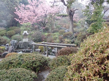 | 今日は雨である。JR相模線の倉見駅を降り立った。ふり返るとコンクリート造りで入口がアーチ型の特徴ある駅舎である。多機能券売機があり無人化されていた。歩いて4分ぐらいで左に折れて踏切を渡りJX金属(株)倉見工場正門前に倉見桜緑道・緑地公園がある。ここの桜町会館の軒先を借りて受付となった。 雨がしきりに降るなか赤、黄、緑の雨具を付けたウォカーが踏切を渡ってくる。時折相模線がそばを走り去る。 傘をさしながらの出発式。雨時、昼食をとる場所もなく、寒川駅に向かって歩き、本日の行程の3分1の距離を歩くという。 緑地公園を出て踏切を渡り、まっすぐ進み県道46号線産業道路を南下し寒川神社へ向かった。神社の脇から敷地内に入り、砂利道を歩き南門を通り神門の前に出た。この雨の中以外と参拝客がおり、にぎやかな感じがした。参道を通り、三の鳥居をくぐり太鼓橋を巡って、信号を渡った左前方に西善院がある。先を行った班が参拝を済ませて列になっていた。境内に入ると本堂の左手に弘法大師様の銅像が雨の滴を受けていた。ここは62番、73番札所となり弘法大師像が2体祀られ、本堂右手に握手すれば縁が結べる握手大師像が安置されていた。 降りしきる雨のなか、先を急ぎ大きな水たまりを避け、寒川中央公園脇を進む。ちょっとした小高い処に「大神塚周辺古墳群E号墳について」の説明看板を右手に、安楽寺の裏手から境内に入った。紅梅が満開で木の下は赤い花びらで染まっていた。本堂に参拝し、振り向くと白梅が色づき何輪か咲いていた。「相模國準四国八十八箇所」の霊場として6・71・75番の弘法大師坐像が安置されている。池がある庭園には早咲き桜が満開であった。 5分ほどで目的地の寒川駅に到着した。午前10時30分頃であったろうか、巡拝帳に貼る、今日訪れるはずだった10体の弘法大師像の写真シールを受取り、駅舎へと消えていったウォーカー。 本日は雨の中お疲れ様でした。 (藤井 誠) |