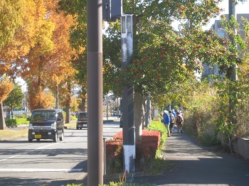 | 広い車道を横断しゴールの慶応大学前へ | ゴールに向かう道路のメタセコイヤの紅葉 |