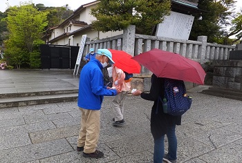 集合場所の御殿辺公園に着くと参加者が次から次と集まり、FWAとKWAほかの2列に並んでもらい受付開始の時間(9時)までお待ちいただいた。なお、本日のコースのメインである「鎌倉道 大仏切通」は前々夜、前夜からの雨で、相当ぬかるんでおり、とても滑りやすいことから、そこを避けて迂回路を進んでもらうこととした。(地図で迂回路を明示し、立哨者が説明する)