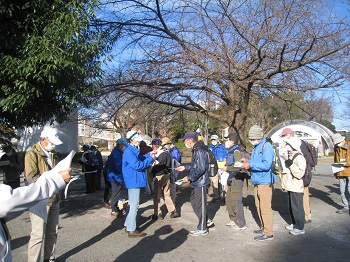9時頃、受付開始とともに並んでいた参加者が次々と受付を済ませ地図を受け取り公園を後にした。今日は今年最後のゆっくりウォークであるため、ゆっくりウォークの完歩賞・努力賞対象者には各賞の授与も行われ、スタッフも忙しそうに対応していた。