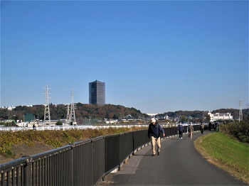 先頭から15分程遅れて、レポート役の私も南出口から湘南台中学校沿いの台地の道を南東方向に向かった。コースは交通量の少ない住宅・畑・果樹園などがある歩き易い道を選んで設定されている。亀井野で台地から境川沿いに下って田園地帯の農道を歩く、稲はとっくに刈り取られ一面稲株だけが残っている。良く晴れあがって風もないため歩いていると汗をかくほどで、ウォーカーも上着を脱いでシャツ姿が多い、私も途中から上着を脱ぎ軽快に歩いた。境川からは、横浜俣野の丘の上に薬科大学の多重塔の建物(図書館)が聳えて見え、川沿いの殺風景な風景に花を添えていた。