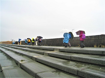 | 久しぶりの雨が未明から降り続き、肌寒く雨の中でのウォークメイトとなった。 スタッフが集合したところで、チーフリーダーとサブリーダーによる打ち合わせを行い、受付場所は予定していた水族館前のクラゲ広場から江の島に向かう地下通路に変更、コースもゴールを辻堂海浜公園から鵠沼海岸サーフビレッジに変更して行うことになった。 雨により参加者の集まりは少ない、予定通り9時半頃受け付け開始、最初の10人ほどのグループが出発、私もこのグループについてレポートした。 雨に煙る江の島をあとに海岸に出たが観光客はゼロ、片瀬海岸西浜の遊歩道に出ると海にはこの寒い雨の中、サーファーの群れがあった、波はほとんど無く漂っているだけ?に見えた。 ひっそりした海岸線を我々ウォーカーのグループだけが歩いている、そんな状態が続く砂浜を何台もの重機が浜辺の整備に精を出していた。例会のタイトルになっている「富士に向かって・・・」の富士山も全く見えないなか、黙々と進む。 そうこうする内サーフビレッジにゴール。雨の中の短いウォークでした、お疲れさま。 (阪本 茂義) |