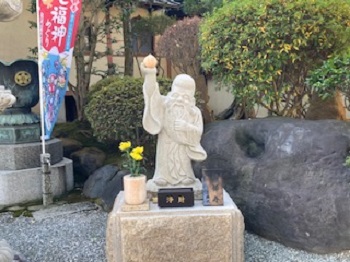 | 寄り添う七福神とFWAののぼり旗 | 常光寺のユニークな福禄寿様 | |