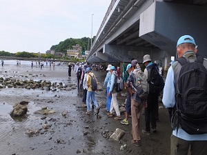 | 「ゴミゼロクリーンキャンペーン」は毎年5月30日の「ゴミゼロの日」にちなみ、海岸をきれいにするとともに、海岸美化への意識啓発を目的として直近の日曜日に藤沢市と地域の団体等が中心となってボランティアで海岸一帯の清掃を行うイベントである。このイベントは1977年(昭和52年)に開始された。湘南ふじさわウォーキング協会としては2000年(平成12年)からこのイベントに参加しており、コロナの感染で2020年、2021年は中止となったが、2022年、2023年に引き続き今年も開催され参加した。雨を心配したが天気も暑からず寒からずの丁度良い天気に恵まれ、朝から企業や団体や町内会など大勢の参加者が片瀬東浜に集合した。子供連れ、愛犬連れなどで海岸が埋め尽くされた。鈴木藤沢市長の開催の挨拶の後、9時から一斉に清掃をスタート。子供たちも大人に混じり楽しそうにゴミを拾ってはゴミ袋に入れ、集めたゴミを所定の場所に集めて処理し、10時に清掃は終了した。 清掃終了後FWAはスタッフの合図で参加者は体制を整えウォーキングをスタートした。 今日(5月26日)は丁度江の島のトンボロ(大きく潮が引き砂地が江の島まで続く現象)が現れる日時(10時〜14時)とぶつかり運よく江の島への砂地を途中まで歩くことができた。 トンボロから陸地に上がり、片瀬江ノ島駅を左に見て境川の左岸を暫く進み、右手の住宅に架かる鯉のぼりの泳ぐ姿を眺め、山本橋を渡り左手の「西浜公園」(山本公園)で水分補給と休憩を兼ねて一休みした。 休憩後、境川の右岸を進み穏やかな川の流れを楽しみ、江ノ電の鵠沼駅を過ぎたところを左折し、静かな鵠沼松が岡の住宅街を進み、途中新しくできた「上藤ヶ谷公園」の脇を通過、暫く進み右手の「鵠沼高校」を左折すると、「桜小路公園」に到着。公園の中の第1蓮池、第2蓮池の青々とした蓮の葉(花は6月にならないと開花しないが)を堪能した後、江ノ電の石上駅の近くでゴールとなりIVVを配布し本日のウォークを無事完了した。 (露木 照久) |