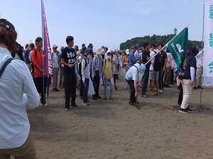 | 小田急「片瀬江ノ島駅」でスタッフ集合 | 片瀬東浜で参加者の受付 |