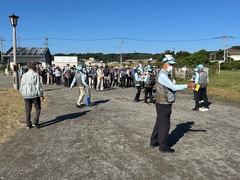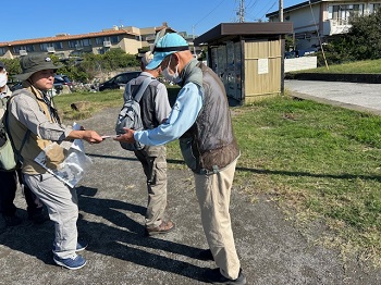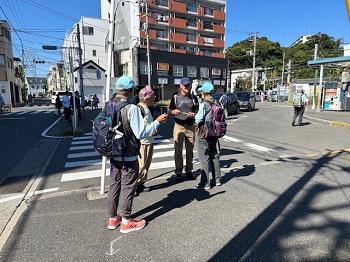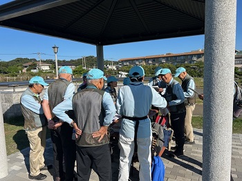 | 出発前の打合せ。 | 今日のスタートは鎌倉海浜公園。 開けた海岸の青空がやばいです。 |