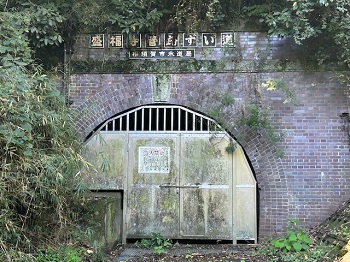 盛福寺管路隧道の出口。勿論入れませんが、 横須賀水道を通す苦労が偲ばれる施設です。 |