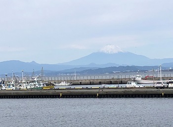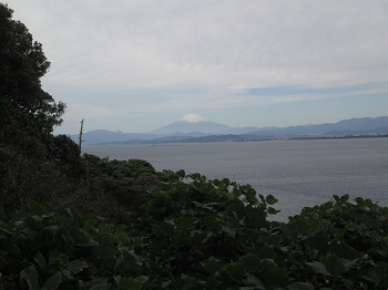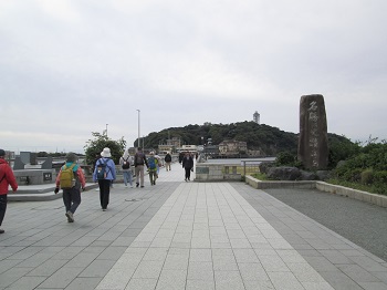 相変わらず風があって気温は低く曇っていたが、江の島の弁天橋に来ると富士山の雄姿が右手の海上に姿を現した、それも初冠雪で6合目辺りより上が白く雪化粧していた。ウォーカーも観光客も見とれて写真を撮る人が多かった。