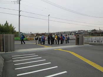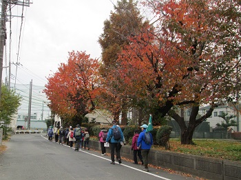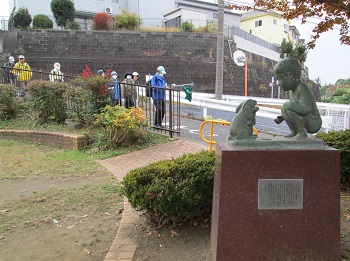 | 朝から曇り空でいつ雨が降り出してもおかしくない天気、予報も午前中から雨になるようである。気温も上がらず15℃以下の寒い中でのウォークメイトとなった。 そんな天気状況から、集合場所を長後市民センターから長後駅西口に変更して受付を実施した。参加者もいつもより少ないように感じた。ウォークメイトの歩行体制はいつもの様に小グループ15~20人で班分けをして、時間を早めて9:40頃出発、1班と共にレポート開始。 最初の立ち寄り個所は長後市民センター。入り口を入ると左手の高い壁面に巨大な陶板レリーフがあった。アートスペース学芸員のお二人(鎌田さんと吉田さん)が既に待機されていて、交代しながらこの作品について詳しく説明してくれた。実物の大きさにびっくり、壁面上段全面に張り付けられた作品は「にっぽんの詩」、右左に風神・雷神、中央に富士山とその下には祭りの情景がカラフルに描かれている見応えのある大作である。 市民センターから出て長後中学校前を通って湘南台方面に向かうと渋谷の里公園に到着、入口でパブリックアートが迎えてくれた。とても愛らしい「子どもとウサギ」乳緑色の石像であった。暫く交代で観賞した。ここまででウォークを終了する4kmコースを選んだ方が4人いた。この公園で2班の到着まで待ち、2班の4kmで上る人達と一緒にスタッフの誘導で湘南台駅へ向かうことになる。 この先、10月4日の例会で歩いた善然寺前を通り境川に出て下土棚遊水地管理棟に到着。トイレ休憩後、いすゞ工場北側を西へ向かう。この辺りから小雨が降り出しこの先が心配された。 チーフの指示でこの先の予定コースを歩くのは断念、小雨の中を慶応大学バスターミナルを目指すことになった。東山田交差点から左方向にコース変更し豊受天神前を通過し歩いていると思いがけず満開のざる菊畑に出くわした。5色のざる菊に参加者から「わーきれい」と歓声があがった。ちょっと得をした気分になった。慶応大学バスターミナルに到着したのは11時半頃であった。 計画していて行けなかったパブリックアートは、少年の森のブロンズ像「友情」と大黒橋のステンレス製モニュメントであった。2か所の写真も参考に掲載しました。 小雨模様の天候の下、全部のコースを歩くことが叶わず残念。お疲れ様でした。 (阪本 茂義) |