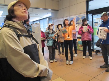 | パブリックアートの説明を受ける | 下土棚遊水地公園管理棟でトイレ休憩 |