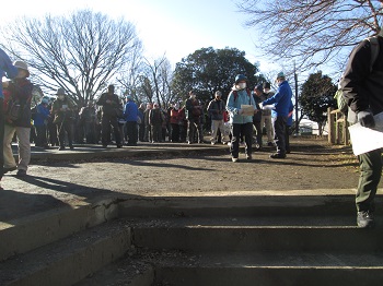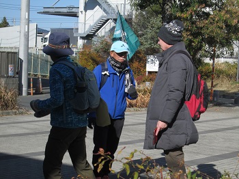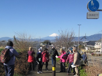 | 公園を出てロングのウォーカーと合流 | 緩い坂を上ると富士の雄姿に歓声 | |