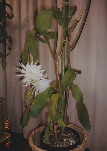 白い花がことしは一枝に二輪咲きました!花は香りが強く、花冠は 20㎝ ほどあります。夜に咲き始めて翌朝までの一晩でしぼみます。