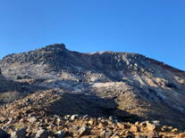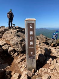 下山は火口のお鉢周りで下るが前回の登山で痛めた脚が気になります。 茶屋前に戻り、朝日岳を見ると稜線には大勢の登山者が見える。朝日岳には手前の山を回り込むように歩くと恵比寿大黒の標識前に、前方上の登山道には登山者の姿が見える。茶臼岳の登りとは違い、急登する岩場の登山道で崖沿いの道と鎖場が続く登りです。下山する人と崖っぷちの細い道をすれ違いながら登ると三本槍岳と朝日岳頂上への分岐場所、朝日の肩です。朝日岳を登り終えて三本槍岳に行く登山者とその先の稜線上にも登山者が確認できます。 朝日岳への道は岩場だが登りやすくわりと楽に頂上に到着した。 頂上から眺望はとても良く、先ほど登った茶臼岳が大きく見える。三本槍は手前の山で見えないが右手下には黒磯の街が霞んで見える。