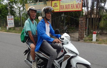 | ロイ君運転するバイクに乗ってマイさんの家に向かう(後ろの看板 BIA HOI HA NOIは生ビール・ハノイと読む) |
